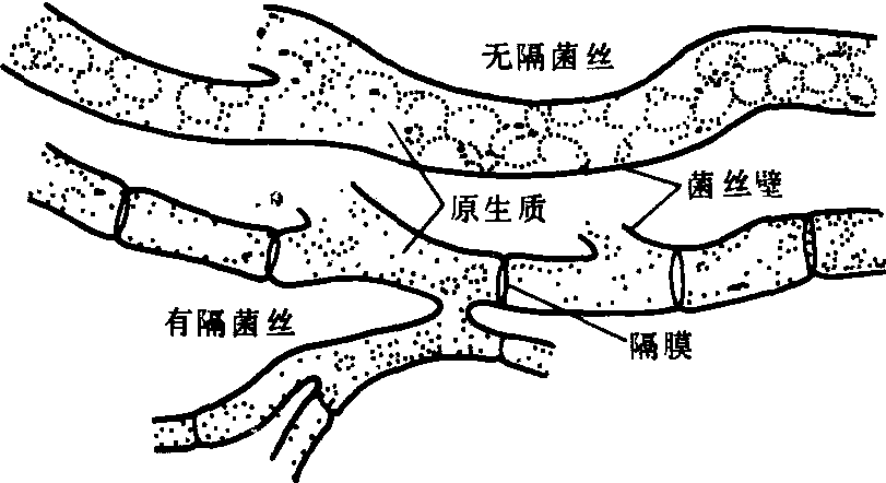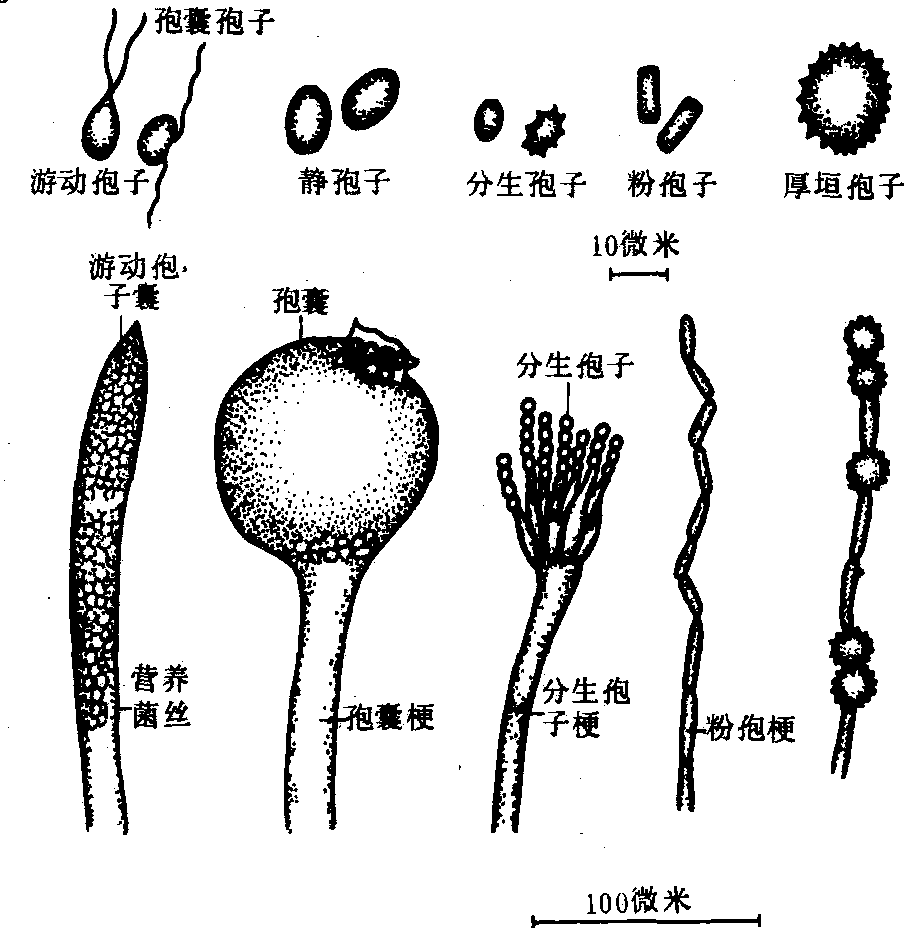 图 1 真菌的两种菌丝 菌丝的隔膜 各类真菌的隔膜构形各不相同,有单孔型隔膜,是子囊菌菌丝的典型隔膜; 多孔型隔膜,如一些丝状酵母菌(Saccharomyces); 复式型或桶状隔膜,如多种担子菌的双核菌丝的隔膜。隔膜孔通常能容许包括核在内的一些细胞器通过。 菌丝的变态 一些专性寄生菌可在菌丝上形成小突起,穿过寄主细胞壁,在细胞内发育成球形、指状或分枝状的吸器吸取养料。某些捕食性真菌常通过其变态菌丝——菌环或菌网来捕食线虫、轮虫等。小煤炱科真菌菌丝可生出1~2个细胞的短枝,称附着枝,使菌丝附着在寄主上。锈菌目真菌的芽管或菌丝顶端膨大,产生附着胞并分泌粘性物,牢固地粘着在寄主表面,附着胞上又生出纤细、针状感染菌丝,再侵入寄主角质层。 菌丝的组织体 交织疏松,还可看出典型菌丝的长形细胞称疏丝组织; 交织紧密,菌丝细胞变成近于圆形或多角形,类似植物的薄壁细胞称拟薄壁组织,两者又统称密丝组织,在很多真菌中形成各种不同营养和繁殖结构。❶菌核。典型颗粒状,大小不一,小如油菜籽的小核菌属的菌核,大到药用的茯苓重2~3千克,是真菌中最大的菌核。菌核坚硬、色深,藏较多养分,抗逆力强,条件适宜时萌发成菌丝体,或在其上产生形成孢子的子实体; ❷子座 由菌丝体形成,也有和部分寄主组织结合而成,为坚硬、形状不一的垫状结构,还有呈团块状或圆槌状,子实体常在子座表面或内层形成,抗逆力强; ❸根状菌索。菌丝纠缠成绳索状,似植物根,作用与菌核相似,常见于引起树木腐朽的担子菌,能侵入机体并蔓延,条件适宜时从先端继续生长延伸,至一定阶段在菌索上可生出伞状繁殖体。 繁殖 真菌能通过菌丝体的断裂短段生长成新菌丝体进行繁殖,但主要是通过一个营养生长期后形成繁殖机构,产生孢子,再萌发产生新的菌体。油壶菌属等低等真菌繁殖时,整个菌体转化成繁殖组织称整体产果式;多数真菌繁殖时,只在部分营养组织上或其中产生繁殖器官和组织,称分体产果式。 无性繁殖 未经性细胞(核)结合,直接在营养体上产生无性孢子,真菌产生多种类型的无性孢子,一种真菌常产生不止一种类型的无性孢子(图2),主要有:❶孢囊孢子。是产生在孢子囊中的内生孢子。在菌丝分枝的顶端或从菌丝特化而来的孢囊梗顶端形成膨大的孢子囊,其中原生质分割成小块,都含有核,通过细胞游离形成过程,生成若干单细胞的孢囊孢子。孢子囊也有在菌丝中间形成。低等水生真菌如鞭毛菌的孢囊孢子无细胞壁,具一或两根鞭毛,能游动,称游动孢子。其孢子囊称游动孢子囊; 陆生的接合菌生成不能游动、有细胞壁的孢囊孢子,称静孢子。 ❷分生孢子。内生或外生,由特化菌丝先端通过一定方式发生,下方的特化菌丝称分生孢子梗,单生、散生或丛生,成束的称孢梗束或束丝。有的分生孢子梗自垫状菌丝生出,使产孢总体结构呈盘状,称分生孢子盘;有的菌丝堆上生出分生孢子梗和分生孢子,称分生孢子座。还有的分生孢子生在覆碗状或球形的分生孢子器中。