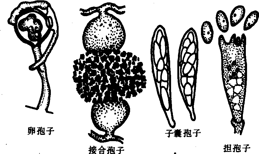 图 2 真菌的无性孢子 有些真菌菌丝断裂后产生一些其他类型的无性孢子。如粉孢属产生的粉孢子和地霉属产生的节孢子;有些在菌丝顶端或中间产生一个厚壁休眠孢子,如总状毛霉产生的厚垣孢子,具强抗逆力;还有芽生方式生成的芽孢子,如假丝酵母和玉米黑粉菌。 有性繁殖 包括两个可亲合性核的结合,经一定过程产生有性孢子。首先是进行质配,带有单倍体核(N)的原生质配合,细胞中成对的核称双核或结合核,常以(N+N)来表示核染色体数,仍为单倍体核; 其次是核配,两个核进行配合,产生二倍体核(2N);最后由核配生成的二倍体核发生减数分裂,形成4个单倍体核(N)。含单倍体核的细胞以后发育成单倍体的营养体。有些真菌在质配后随即进行核配,双核期很短;有些质配后要经相当长时间才进行核配,双核期较长。同时减数分裂发生的时期也有不同。不同真菌产生不同类型的有性孢子(图3)。