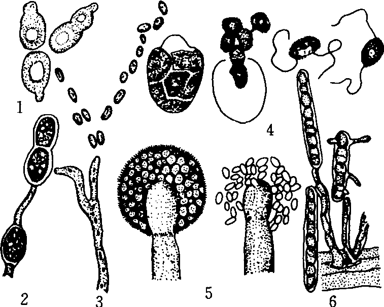 1.芽孢子; 2.厚垣孢子; 3.粉孢子; 4.孢子囊及游动孢子; 5.孢子囊及孢囊孢子; 6.分生孢子