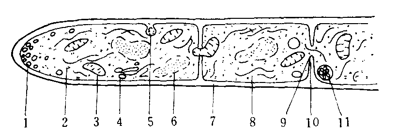 细胞壁 细胞的最外层结构,集中细胞30%左右的干物质,可以保持细胞的形状。主要成分是己糖或氨基己糖构成的多糖链β1,3-β1,6-葡聚糖。多数真菌的细胞壁由几丁质组成,不同于植物细胞壁多为纤维素组成,但卵菌细胞壁是纤维素组成的,酵母菌细胞壁的主要成分是甘露聚糖。不同纲的真菌细胞壁组分不同,细胞壁的组成成分与真菌的分类有一定的相关性。 细胞质 由细胞膜包裹着的水溶性物质,内有多种细胞器和酶类。细胞器分离的方法是首先将菌丝体打碎成单个细胞,然后用机械法或酶法破壁,使细胞器释放,再用差速离心法或密度梯度离心法纯化各种细胞器。由于可溶性物质,特别是蛋白质的存在,使细胞质具有溶胶—凝胶的转换能力,呈半固体状(凝胶状),或液体状(溶胶状)。近年通过电镜观察到细胞中有微小的蛋白质微丝和较大的微管。随着新技术的广泛应用,在细胞质中将会发现更多的细微结构。 质膜 细胞质周围的膜,在电镜下观察类似生物的单位膜,具有典型的三层结构。主要成分为磷脂分子,规则地排列成两层,不恒定,常呈微团构型。蛋白质是无定形分子,非对称地排列在磷脂两边,蛋白质颗粒分布不均匀,呈镶嵌状。固醇夹杂在磷脂之间,与磷脂比例为1:5到1:10,真菌细胞膜含有类脂、蛋白质、碳水化合物和核酸,与动物细胞膜组分相近。但真菌细胞膜的碳水化合物含量高,如白色假丝酵母,其含量为菌丝干重的25%,一般生物的含量低于10%。 线粒体 含有DNA的细胞器,封闭式环状,周长19~26微米。根据形态学和生物化学研究证实真菌线粒体的功能和动植物相似,是细胞呼吸和产生能量的场所。圆形或椭圆形,有时呈分枝状。线粒体具有双层膜,内膜较厚,向内延伸成不同数量和形状的嵴。嵴的外形与真菌的类群有关,细胞壁为几丁质的真菌,如壶菌、接合菌、子囊菌和担子菌,具有板状的嵴。细胞壁为纤维素和无壁的真菌如卵菌,前毛壶菌具有管状嵴,与高等植物和多数藻类相似。 核蛋白体 蛋白质合成场所。有的呈游离状态,为单粒蛋白体,有时结合成多聚蛋白体,有的与内质网或核膜结合。真菌细胞有两种核蛋白体,即细胞质核蛋白体和线粒体核蛋白体。细胞质核蛋白体的RNA通常由于沉降系数不同而分为25S,16S,5.8S和5SRNA分子,而25S RNA分子的分子量在各类真菌中有一定差别。几丁质细胞壁的真菌与纤维素细胞壁的真菌25S RNA的分子量比粘菌的小,所有真菌的25S RNA分子量介于人和大场杆菌之间。真菌的18S RNA的分子量也与人类和植物的不同。 内质网 细胞中各种物质运转的循环系统,并且供给细胞质中所有细胞器的膜,常与核膜相连。多形态的结构,是由狭窄的腔分隔或封闭的管道系统,有时是分枝的管道。主要组分是脂蛋白,游离蛋白和其他物质。它的形状和大小与环境条件、发育阶段和生理状态有关,一般在幼嫩的细胞中较多。被核蛋白体附着的内质网,称为粗糙型内质网,没有被核蛋白质附着的内质网,称为光滑型内质网。 高尔基体 一堆平滑的池,并具有泡囊状的边缘。目前有高尔基体的真菌种类不多,仅在根肿菌、前毛壶菌、卵菌和腐霉菌中常见,接合菌、子囊菌和担子菌中尚未见到。由于真菌中高尔基体的发现,进一步肯定真菌是真核生物。 泡囊 双层膜包围而形成的结构,含有蛋白质、多糖和磷脂酶等,大量存在生长的菌丝顶端细胞中,泡囊有多种功能、与菌丝顶端生长有关,有些寄生性真菌的泡囊与高等植物寄生关系有关。有人认为泡囊来源于高尔基体,但高尔基体仅在少数真菌中发现,所以认为泡囊可能是由内质网的特殊部位形成的。 液泡 一种由不同细胞组分集结的细胞器。液泡的形态变化很大,大小和数目随菌龄或菌丝老化而增加,小液泡可聚集成大液胞,大液泡可分成许多小液泡。液泡的膜组分尚未了解,但液泡内含物十分特殊,有许多贮藏物质,如各种碱性氨基酸常游离到液泡外,多磷酸也贮藏在液泡中,还含有多种酶,如蛋白酶,酸性和碱性磷酸酶,反录酶、纤维素酶等。 细胞核 为膜包裹的含有细胞遗传物质的细胞结构。一般直径为2~3微米,比动植物的细胞核小。细胞核的形状和大小变化很大,通常为椭圆形,可通过菌丝隔膜上的小孔。不同真菌的细胞核数目变化很大,最多的达20~30个核。真菌的营养细胞一般是单核的或双核的。真菌细胞核内的染色质比较小,不易染色,含有组蛋白和DNA与其他生物一致的。DNA的大小为6~30×109道尔顿,比高等植物和哺乳动物的小得多。 核膜 细胞核表层的双层膜,核膜的外膜常有核蛋白体附着。核膜上有小孔,使核质和细胞质互相交流。 核仁 细胞核的中心稠密区。含有大量核糖核蛋白体RNA和其他合成核糖核蛋白体的前体。核膜和核仁在真菌核的分裂中永久存在,纺锤体在核内形成,与其他高等动、植物不同。 膜边体 真菌细胞中的一种特殊的细胞微结构,位于细胞膜和细胞壁之间的单层膜包围的细胞器。膜边体(losasomes)的形状和位置与细菌的中体相似,又称为“真菌中体”,尚未在真菌菌丝细胞以外的其他生物细胞中发现。膜边体的形状变化很大,可分管状、囊状、球状、卵圆形或多层折迭的膜,内中含有泡状物或颗粒状物,有时膜边体与其他细胞器或细胞膜相结合。一般认为膜边体含有水解酶,能水解多糖、蛋白质和核酸,也有人认为与细胞壁的合成有关。 此外,微体普遍存在于真菌细胞中,常呈圆形或椭圆形,与