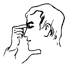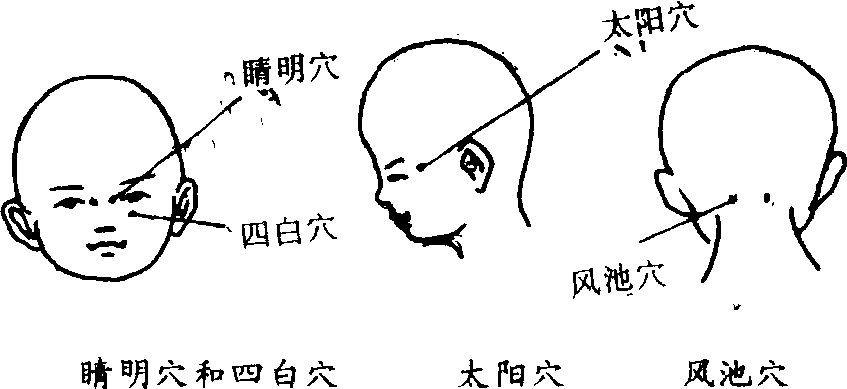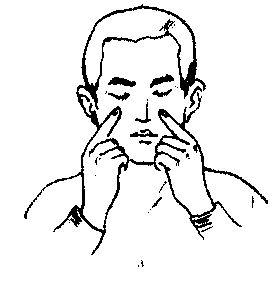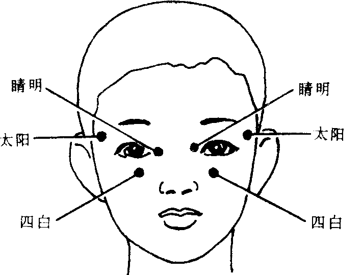 按太阳穴并轮刮眼眶 做眼睛保健操时应闭着眼睛;指甲剪短,并保持手的清洁;按揉穴位要准确,手法柔和,以产生酸胀感为度;要坚持操练,每天上下午各做一次,每次做四节,每节均为8×8拍。 眼保健操见体育基础理论中“眼保健操”。 眼保健操根据人体的经络穴位,运用祖国医学的推拿法,结合医疗体育综合而成的一种按摩疗法。1960年由中医推拿科和西医眼科共同编制。通过对眼部周围穴位的按摩,可增强眼窝内血液循环,改善神经营养,以达缓解睫状肌紧张或痉挛,消除视疲劳的目的。如能坚持做操,对穴位掌握准确并和用眼卫生结合起来,对保护视力和预防近视可起到良好作用。该操编制后在我国中、小学校普遍采用。一般每天作两次,做操时间以在看书、写字后为适宜。穴位要准(见图6.3—1),手法要缓慢柔和,先轻后重,以有酸胀感为合适。指甲要剪短,手要保持干净。面部有疖肿或眼睛有炎症时暂停。方法:远眺,两眼前视、放松。第一节挤按睛明穴。睛明穴在内眦(内眼角)外0.3厘米处,闭合双眼,用双手拇指按在睛明穴上,向鼻根处挤按,一挤一按为一拍,连做四个八拍。第二节按揉太阳穴和轮刮眼眶。太阳穴在外眦(外眼角)与眉之间向后大约3厘米之处。用两手拇指按在太阳穴上,两手食指第二节的内侧轮刮上、下眼眶缘,先上后下各二拍,然后用拇指揉太阳穴四拍,共四个八拍。第三节按揉四白穴。四白穴在下眼眶缘下边的中间,直对着瞳孔。可用两手的食指和中指并拢,放在鼻子两侧,中指尖挨鼻翼,大拇指支撑在下颌骨凹陷处,然后放下中指,食指尖所指处即四白穴。按揉四白穴,共四个八拍。第四节按揉风池穴。风池穴在颈后枕骨下,胸锁乳突肌后缘(两条大筋外侧)的凹陷内。用两手的食指和中指按揉风池穴,每两拍按揉一下,共按揉四个八拍。第五节干洗脸。两手四指并拢,沿鼻梁两侧向上推到前额,然后绕两侧太阳穴,再往下拉。向上推四拍,向下拉四拍,共做四个八拍。