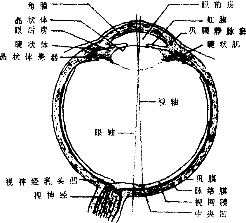 图498 眼球的结构(水平切面模式图) 眼球bulbus oculi视觉器官具有感光作用的主要部分,由三层眼球壁及折光系统构成。眼球壁外层为纤维膜,前部约1/4部分完全透明称角膜,后部3/4为白色不透明的巩膜。中层为血管膜,分为脉络膜、睫状体和虹膜三部分。虹膜位于晶状体前方,中央有瞳孔。内层为视网膜,能接受光的刺激,产生光觉和色觉。折光系统有水状液、晶状体和玻璃体3种。水状液为无色透明的液体,位于眼房(角膜与晶状体的间隙,又被虹膜分为眼前房与眼后房,经瞳孔相通)内。晶状体为无色透明、有弹性的双凸体,与睫状肌相连,借肌肉收缩来调节其曲度。玻璃体为无色透明的胶状体,位于晶状体与视网膜之间。