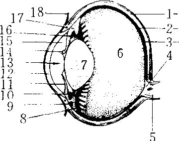 眼球纵切面 1. 巩膜 2.脉络膜 3.视网膜 4.视乳头 5.视神经 6.玻璃体 7.晶状体 8. 睫状突 9.睫状肌 10.晶状体悬韧带 11.虹膜 12.角膜 13.瞳孔 14.虹膜粒 15.眼前房 16.眼后房 17.巩膜静脉窦 18. 球结膜 眼球眼球的外形近似球体,前后径最长约24 mm,水平径居中约23.5 mm,垂直径最短约23 mm,眼球经线圆周的长度约74.91 mm。眼球的容积,新生儿平均为2.8 mL,6个月内婴儿平均为5.25 mL,成人平均为6.8~7.5 mL。瞳孔的大小,新生儿2~2.5 mm,幼儿4 mm,儿童4~5 mm,青春期3~4 mm,40~50岁3~3.5 mm,50~60岁2~3 mm,60~90岁2~2.5 mm。不同光线下成人瞳孔直径,晴天昼光2~4 mm,中度照明3~4 mm,暗处7.5~9.6 mm。眼动脉压,收缩压8.0~10.7 kPa(60~80 mmHg),舒张压4.0~5.3 kPa(30~40 mmHg)。 |