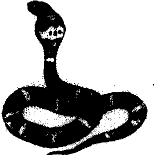 图295 眼镜蛇 眼镜蛇cobra爬行纲,有鳞目,眼镜蛇科。几种毒蛇的统称。分布于非洲(大部分种类)及亚洲温带地区。俗称饭铲头、扁头风、膨颈蛇。分布于中国的有两种:印度眼镜蛇(Naja naja)长1~2 m、眼镜王蛇(Ophiophagus hannah)也见于中国南方,体长3.6~5.6 m。眼镜蛇头椭圆形,头颈区分不明显。背鳞23~21(19)~15行,尾下鳞全为双行。体色及花纹变异甚大。一般头及体背为黑褐色;颈部膨扁时,背面易见有眼镜状白色的斑纹;躯干背部常具黄白色窄纹,幼蛇尤为明显;腹面黄白或淡褐色。性凶猛,激怒时,体前半部竖起,颈部膨扁,“呼呼”作声。毒牙为前沟牙,含神经毒及血循毒,毒性强。生活于平原、丘陵及山区,捕食鳝、蛙、蛇、蜥蜴、鸟、鼠等。6~8月产卵。眼镜蛇与灰鼠蛇、金环蛇一起浸制“三蛇酒”,供药用。