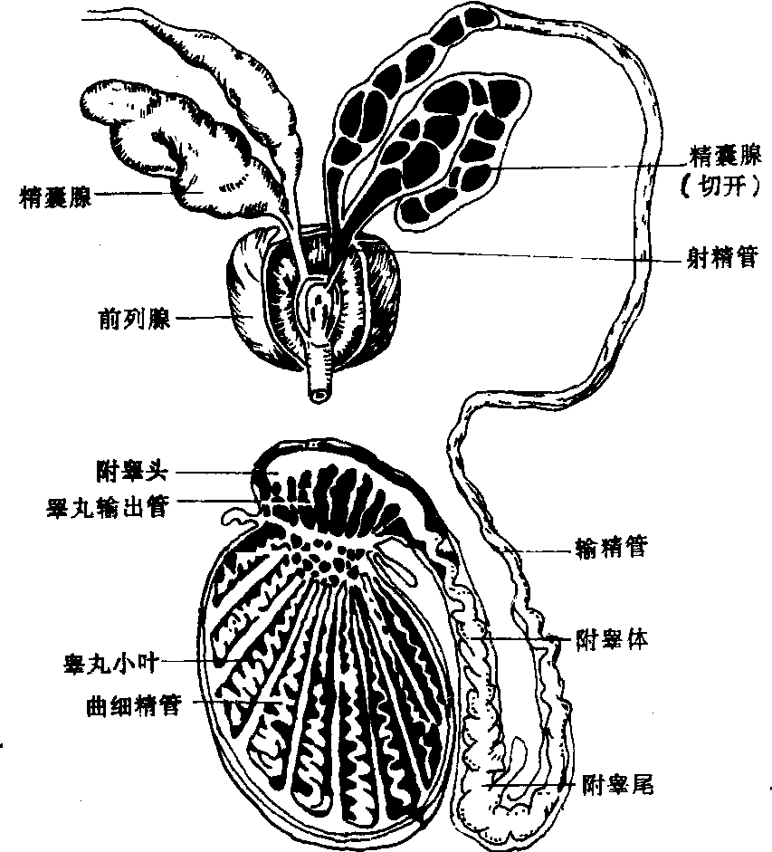 间质细胞 位于曲精细管之间的结缔组织中,常成群分布,数量因动物和年龄而异。马、猪较多,牛较少。胞体较大,圆形或多边形,核圆形,胞质中含有丰富的滑面内质网,高尔基复合体发达。能合成和分泌雄激素,主要是睾酮,释放入细胞周围的组织液中,一部分扩散入曲精细管,其余进入血液。 排出精子的导管 包括相连串的直精小管、睾丸网、输出小管、副睾管和输精管。前两者在睾丸内,输出小管和副睾管则形成副睾。直精细管系由曲精细管靠近睾丸纵隔时变直形成,短而细,管壁衬以单层立方或扁平上皮。直精小管入纵隔互相汇合成网,称睾丸网,管腔大而不规则,由单层立方或扁平上皮构成,其外围以纵隔的结缔组织。由睾丸网分出20条左右输出小管,入副睾头,其管腔不规则,管壁上皮为假复层柱状纤毛上皮,纤毛的煽动有助于精子向副睾管方向运动,上皮外包有薄层结缔组织和少量平滑肌纤维。副睾管,是一条管腔大的长而弯曲的细管,在副睾头内连输出小管,然后迂曲而形成副睾体和副睾尾。管壁也衬以假复层柱状纤毛上皮,腔面平整,纤毛不能运动,属静纤毛,由微绒毛束构成,有助于柱状细胞分泌物的排出以营养精子,使精子进一步成熟并贮存在副睾管的后段。输精管,在副睾尾与副睾管相连续,管壁粗厚,由粘膜、肌层和外膜构成,粘膜有纵行皱襞,因而内腔呈花瓣状; 上皮由假复层柱状纤毛上皮过渡到单层柱状上皮; 肌层发达,一般分内环形和外纵行肌层; 外膜主要为浆膜。 睾丸系于精索下端,包裹在阴囊内,左右各一个,呈卵圆形,表面光滑,呈青白色,如鸽子蛋大小,一般左侧睾丸稍大于右侧,也比右侧稍低。睾丸是男性生殖器中最重要的器官,具有产生精子和分泌男性激素功能。睾丸内的精子对温度极为敏感,受冷刺激时,阴囊的肌肉就会收缩使睾丸提升,借助身体的热量提供温暖的环境;天气炎热时,阴囊变得松驰,使睾丸偏离身体,以便散发阴囊的热量,保证睾丸正常功能。 睾丸gaowan男性的生殖腺。左右各一,卵圆形,位于阴囊内,与附睾、输精管相连。睾丸长3~4厘米,每个重10~15克。幼年期睾丸较小。在性成熟之前,睾丸发育缓慢,至性成熟期生长迅速,开始产生精子,有了生殖能力;老年人则渐趋萎缩,性机能也逐渐减退。睾丸(见图)内有许多睾丸小叶,每一小叶由3~4根曲细精管组成。曲细精管汇集后通向附睾和输精管。曲细精管是精子的发源地。男子到青春期后,曲细精管内的生殖细胞逐渐发育成熟而形成精子。在曲细精管之间的间质细胞有分泌雄激素的功能,雄激素能促进男性附属生殖器官的发育并维持其正常活动。此外男子身体的特征,如发达的肌肉、胡须、阴毛分布的类型、男性的声音等,亦与男性激素有关。,