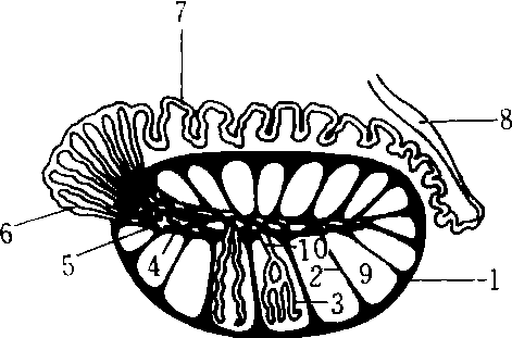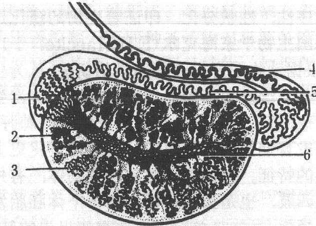 睾丸和附睾结构 1.白膜 2. 睾丸间隔 3. 曲细精管 4. 睾丸网 5. 睾丸纵隔 6. 输出管 7.附睾管 8. 输精管 9. 睾丸小叶 10. 直细精管 睾丸位于阴囊内,左右各一。从睾丸纵隔发出许多放射状的睾丸小隔,将睾丸实质分成200多个锥体形的睾丸小叶。从睾丸网发出12~15条睾丸输出小管,经睾丸后缘上部进入附睾头。 |