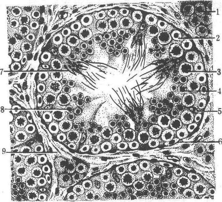 曲精细管 长而弯曲的上皮性管道,长约50~80cm,直径约100~200μm,末端形成襻或盲管,起于小叶边缘,迂曲分布小叶内。横断面上有明显的基膜,上有两类形态结构和功能各异的细胞(图2)。一类是支持细胞,又称足细胞或塞托利氏细胞,呈极不规则的高柱状或锥状,单层排列于基膜上,顶端伸入管腔,侧面和腔面形成许多凹陷供各级生精细胞附着;细胞核大,椭圆或三角形,长轴与管腔垂直,核膜、核仁明显; 胞质中含有丰富的线粒体、内质网、微丝、微管等细胞器,以及糖原和类脂。支持细胞是一种多功能的细胞,它对各级生精细胞具有支持、保护和营养作用,为它们的分化和发育提供适宜的微环境; 参与各级生精细胞向腔面推移和精子释放的作用; 能吞噬退化的精子和精子在变形过程中丢失的胞质残余体;向曲精小管内分泌液体,有助于精子的运送; 它还能合成雄激素结合蛋白、类固醇激素和分泌抑制素等。相邻支持细胞的近基部胞膜形成紧密连接(见细胞连接),它与曲精细管的基膜、睾丸间质的结缔组织、血管内皮及其基膜共同构成血睾屏障,能阻止血液内的大分子异物(如细菌等)进入曲精细管和维持腔内较高的雄激素浓度,有利于生精细胞的发育。另一类是生精细胞,包括精原细胞、初级精母细胞、次级精母细胞、精子细胞和精子。精原细胞是产生精子的干细胞,圆形或椭圆形,位于基膜上; 初级精母细胞为常处于分裂和生长期的生精细胞,位于精原细胞内侧,圆形,细胞较大,核大而圆,有明显的分裂相。次级精母细胞由初级精母细胞进行第一次成熟分裂而来,在初级精母细胞内侧,比前者稍小,其存在时间不长,即进行第二次成熟分裂形成精子细胞。精子细胞为圆形小细胞,不再进行分裂,位置靠近管腔,经过一系列复杂变形,形成蝌蚪状的精子离开支持细胞进入管腔。从精原细胞至精子所需的发育时间,依动物而异。绵羊约49~50天,牛约60天,猪约44~45天,马约50天。在整个曲精细管内,各节段的精子发生不是同步的,并有一定周期性,但从一个精原细胞分裂来的各级生精细胞,分裂时细胞质并不完全分开,互相有少量细胞质相连,此处可作为细胞间互通信息的渠道,使由一个精原细胞发育来的子细胞同步发育、成熟和释放。