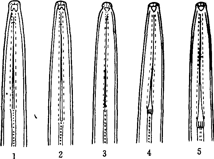 1.长针线虫属; 2.似长针线虫属; 3.拟长针线虫属;4.剑针线虫属; 5.剑线虫属