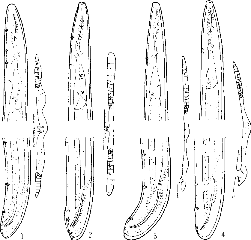 1.毛刺线虫属; 2.拟毛刺线虫属; 3.单毛刺线虫属;4.异毛刺线虫属