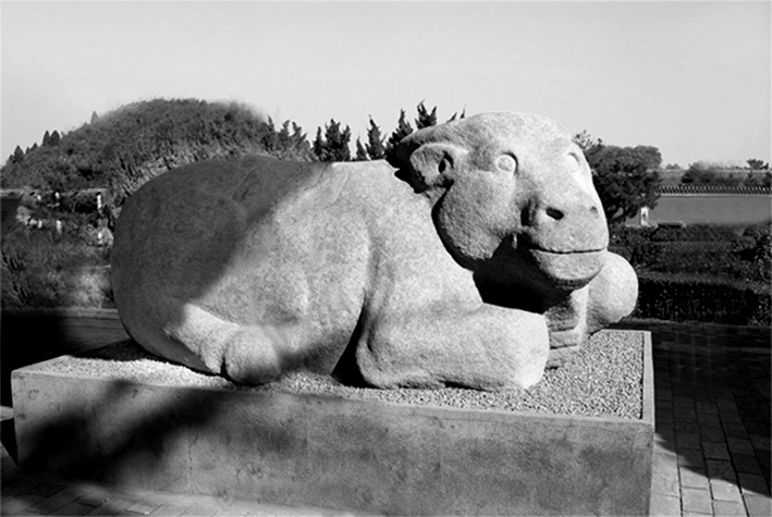 | 释义 | 石卧牛唐。高79厘米,长121厘米。陕西省博物馆藏。牛缩首,偏向左面,四肢内屈,蜷卧于石座上,脊梁圆润,腹背鼓突,质感颇强。其唇鼻肥厚,吻部突凸,睁大圆眼望着远方,神态十分安详。作者把握住牛的生理特征,运用写实的手法,高超的技艺,将牛的外形及内在性格刻划得惟妙惟肖。