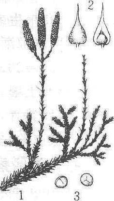石松 1.植株,顶生孢子叶球 2.孢子叶的正反面 3.孢子 石松陆生植物,植株长50—100厘米。主茎长,匍匐,稀疏,斜展。叶互生,螺旋状排列线形或线状披针形,全缘。产察布查尔。石松粉为冶金工业上的优良脱膜剂,也用于照明工业中,药用为撒布剂和丸衣,茎叶供药用。有祛风痹、活经络的功能。 |