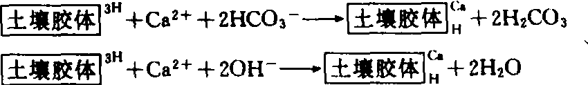 随着土壤溶液中Ca2+和OH-离子浓度增加,Ca2+离子即把土壤胶体上交换性氢离子置换下来,从而达到中和土壤酸度的目的,同时还提高了土壤盐基饱和度,土壤理化性状得到改善,其反应式为: