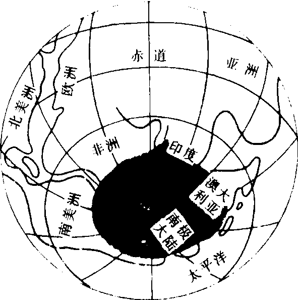 石炭二叠纪大陆位置及冰川分布图 (暗色部分为冰川分布范围) |