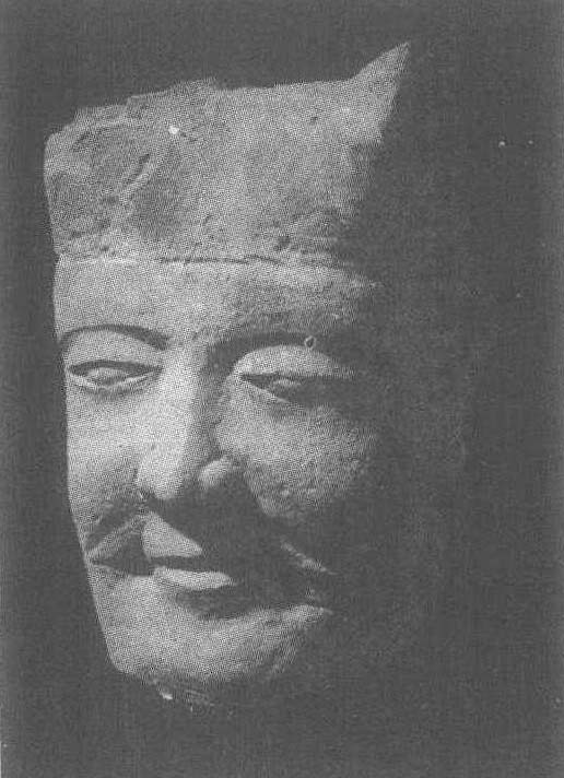西夏。头长31厘米,面阔17厘米。1977年宁夏回族自治区银川市西夏陵区101号陪葬墓出土。宁夏回族自治区博物馆藏。白砂石质。国字形脸庞,深目高鼻,凸颧丰腮,双唇微启,八字形胡略翘,微带笑意地盯着前方,神态十分生动。