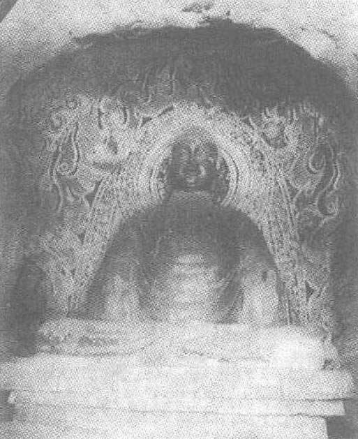 | 释义 | 石雕佛坐像北齐。高3.5米。河北省邯郸市北响堂山石窟第七窟中心柱正壁龛佛造像。佛头挽螺髻,眉饰白毫相,身着多皱袈裟,结跏趺端坐于覆莲台座上,俯视着下界。神态典雅庄严。桃形背光外缘饰满各种颜色的龙纹、火焰纹,其内在双重连珠纹中间,镂饰繁缛的忍冬纹。头光顶部为一凸目圆睁的龙首。佛像体魄雄健,气势恢宏,为响堂山石窟中最大的造像。