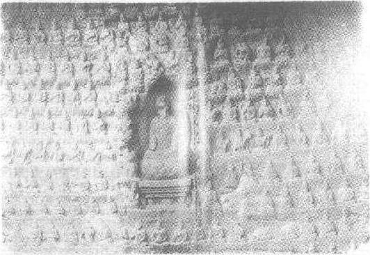 | 释义 | 石雕千佛龛中唐。龛高261厘米,宽480厘米。四川省仁寿县牛角寨摩崖造像第28龛。此龛正中部位雕主佛释迦牟尼,身穿通肩袈裟,结跏趺坐于莲座之上。莲座由束腰方台承托。佛身后有桃形身光和椭圆形背光。主佛的四周满布高24厘米的座像共285身,有的跪拜,有的奏乐,有的捧贡物,服饰不同,姿态各异。形式虽为千佛龛,人物却为菩萨、伎乐、罗汉等各种形象。刀工刚劲有力,线条简练概括。佛龛保存较为完整,内容特殊,在四川省的石窟中颇为少见。