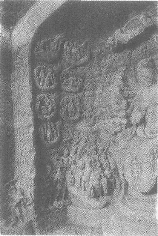 | 释义 | 石雕千手观音龛盛唐。龛高125厘米,宽120厘米。主像高100厘米。四川省丹棱县郑山第64龛。千手观音为佛教密宗六观音之一。此龛千手观音面部已毁。身披通肩袈裟,胸佩精致的璎珞,体态丰腴,结跏趺坐于重幔流苏的须弥座上。观音身侧有12只手(部分残缺)。龛两侧壁面上浮雕佛、菩萨、天人、护法神众。菩萨有的骑兽,有的骑牛,还有的骑孔雀。最为精彩的是二十八部众诸护法神,以男女善恶的不同形象出现。所穿服装各异,有的衣衫宽大,有的上身裸露,下着长裤,有的体态丰满,有的肌肉发达,有的性格温和,有的面目狰狞,形象特点十分突出。整龛雕像构图严谨,层次分明,雕刻技法熟练,线刻与浅浮雕,高浮雕结合,表现力很强.具有很高的艺术价值。