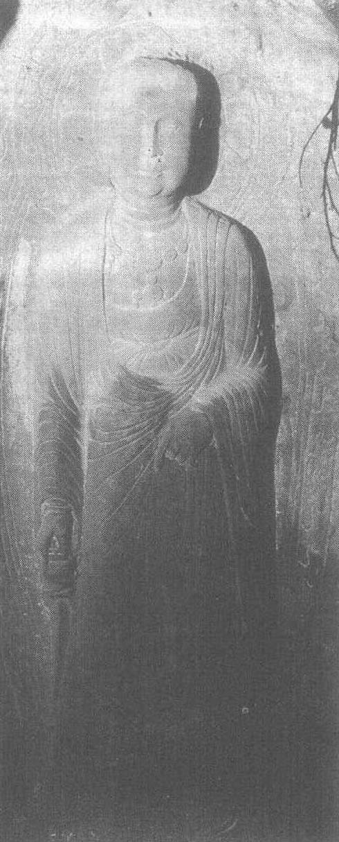 | 释义 | 石雕地藏菩萨像唐。高180厘米。四川省眉山县仙人洞第6龛。地藏菩萨梵文音译“乞叉底蘖婆”。《地藏十轮经》谓其“安忍不动犹如大地,静虑深密犹如地藏。”称其受释迦牟尼佛嘱咐,在释迦既灭,弥勒未生之前,自誓必尽度六道众生,拯救诸苦,始愿成佛。中国佛教把它作为四大菩萨之一,相传其显灵说法的道场在安徽省九华山。此尊地藏菩萨像面型长圆,头微侧,五官端正,双耳尤大。穿通肩袈裟,内着僧祗支,袈裟下垂感强,衣纹自然。左手置腹前,右手握瓶,赤足立于莲座之上,其形象持重而温厚,具有坚韧之气质,造型生动,刀工细腻。