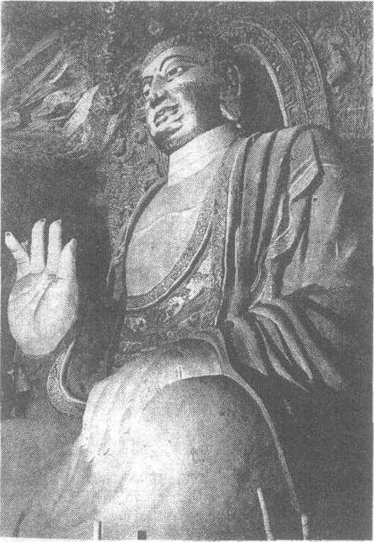 | 释义 | 石雕大佛像唐。通座高2400厘米。陕西省彬县大佛寺造像。佛挽螺髻,颈、胸袒露,身着饰以滚边花纹的袈裟,右手五指叉开,置胸前,左手抚膝,结跏趺坐于台座上。其面容丰腴,双唇紧抿,炯炯有神的眼中透露着睿智的光,眉间饰白毫相。背光饰满蔓草,火焰,化佛,飞天等纹样。佛龛有唐贞观四年(公元630年)的题记。佛像造型魁武,泥塑风格突出,虽历经宋、明、清各代多次修饰,仍不失其伟岸的雄姿。彬县大佛寺位于彬县西十公里泾水岸边的山崖上,是在古代由长安通往甘肃敦煌、新疆一带“丝绸之路”的通道上。