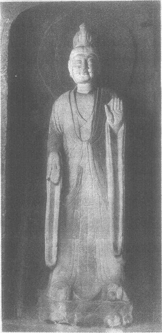 | 释义 | 石雕天尊像唐。高191厘米。四川省剑阁县鹤鸣山道教造像窟第3窟。天尊高立于莲台之上,身材高大匀称,头微昂,左手举起,右手持法器。身着交领衫,外套宽袖长袍,衣纹自然舒缓。脸庞丰润,面露威严,但不失仁慈,令人肃然起敬。头后有浮雕的宝珠形头光,上雕五颗星纹。天尊所立莲台本为佛教的祥瑞物,反映了当时这一地区两教互相融合、渗透的关系。