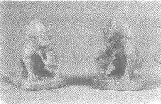 | 释义 | 石雕子母狮(1对)唐。均高11.6厘米,宽8.1厘米。1972年辽宁省朝阳市唐代韩贞墓出土。辽宁省博物馆藏。滑石质,呈浅黄色。其一,母狮鬃毛分披颈肩,左前爪撑地,右前爪搂抱幼狮,后腿内屈,蹲于石座上,俯首盯着幼狮高仰的脸,似在观察它的变化,低眉顺目,表情极为温柔。幼狮则后肢点地,右前爪勾着母狮的胸,人立于母狮的身旁,仿佛要从母狮的脸上,找出什么能使它感到有趣的东西。其二,与前者对称,形态基本相同。作者以高超的技艺将子母狮相守的情形细致入微地刻画出来,表明了狮虽凶猛、威悍,但在血缘关系中,仍具有爱怜、温顺的一面。
