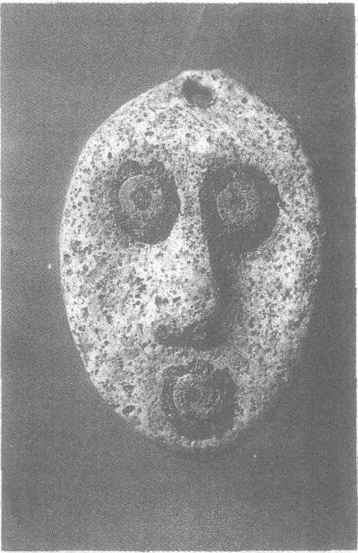 | 释义 | 石雕嵌珠人面像新石器时代(马家窑文化马厂类型)。高3.9厘米,宽2.6厘米。1973年甘肃省永昌县鸳鸯池第50号墓出土,甘肃省博物馆藏。白云石雕制。人面轮廊近似橄榄形,凹陷的圆眼、圆嘴内嵌以黑色树胶粘合的扁平白色骨珠,鼻梁两侧刻凹面,并用黑色树胶点出鼻孔。其头顶处有一圆形穿孔,用以系绳。此像雕刻得质朴纯真,如同出自儿童拙稚之手,为新石器时代石雕艺术品。
