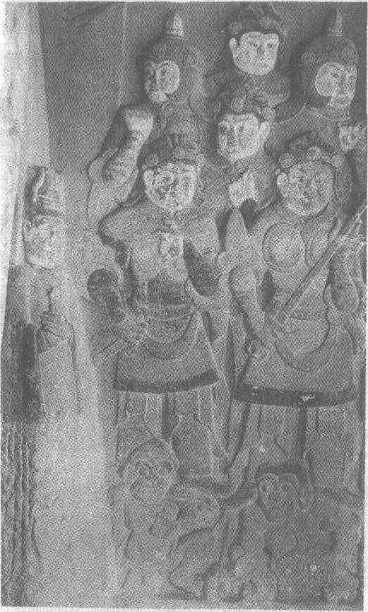 | 释义 | 石雕护法神将像唐。四川省剑阁县鹤鸣山道教造像窟第2窟窟门两侧。各浮雕六位护法神,身高约为0.9—1米,身披铠甲,胸铠两侧有圆护。有的戴铁盔,着战裙,手中分拿兵器和法器。个个面庞丰润,威武雄健。其中右排后壁正中的人黑发蓬松,瞠目耸鼻,形象特殊。神将系道教的护法神,脚下踏有鬼怪,鬼怪面目狰狞可怖,肌肉发达,似在奋力挣扎,但在护法神的强力下又无可奈何。鬼怪之中,有一女性。此两幅浮雕是鹤鸣山石窟中的杰出之作,人物形象生动传神,雕工精炼果断,是道教石刻艺术著作中的必选作品。