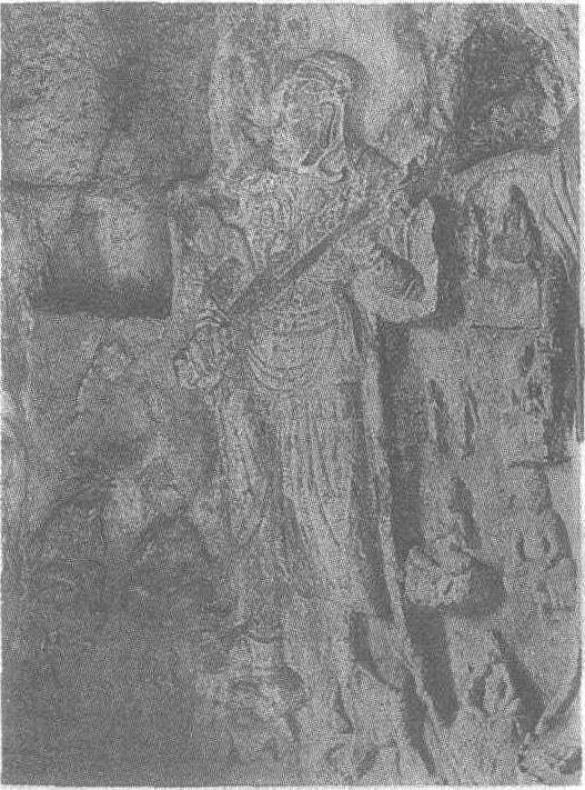 | 释义 | 石雕持剑天王像唐高宗(公元650—683年)时期。高187厘米。河南省洛阳市龙门石窟敬善寺北壁东侧高浮雕。天王头挽发髻,身披两裆铠甲,戴护臂,下着袴褶,足蹬云头战靴,手执剑斜贯胸前,腹微鼓,脚踩二夜叉(或称地神、地鬼,佛经说它是一种吃人的恶鬼。但也被列为守护佛教的天龙八部之一),昂然而立,怒目俯视,一副孔武雄健、无所畏惧的样子,神态十分生动。天王的形象在龙门石窟中,始见于唐代,最早是宾阳北洞和潜溪寺。