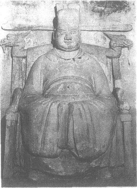 | 释义 | 石雕杨粲坐像南宋淳祐。高97厘米。1957年贵州省遵义皇坟嘴杨粲墓出土。白砂岩质。杨粲头戴长脚幞头,身着圆领宽袖长袍,足蹬圆头履,大腹便便,袖手端坐于龙首搭脑的扶手椅上,窄额宽腮、面如垂梨,两眼一高一低,咄咄逼人地直视前方,双唇紧闭,嘴角微翘,形象威严。此像刀法严谨细腻,致力于人物性格的刻画,是宋代罕见的人物肖像雕刻作品。杨粲,南宋嘉泰年间(公元1201—1204)播州沿边安抚使。
