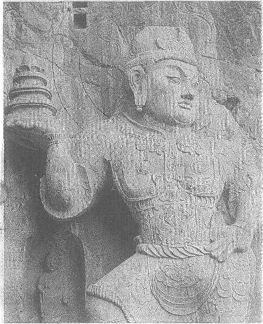 | 释义 | 石雕毗沙门天王像唐。高1030厘米。河南省洛阳市龙门石窟奉先寺北壁东侧造像。天王头戴花形高宝冠,身披花领甲胄,上面刻满龙首、卷云、宝珠、蔓草等精美纹饰,足蹬云靴,右手平托三层宝塔于耳侧,左手叉腰,左胯高耸,威风凛凛地踏夜叉而立,警惕地观望着前方,整个身体几乎扭成S形。其足下的夜叉怒目而视,肌肉块块隆起,一副不甘心被制服的样子,神态颇为生动。“毗沙门天王”即北方多闻天王,是四大天王之一。据印度佛教传说,须弥山腰有一山,名犍陀罗山,山上四峰里,各居一天王,守护一方天下,故统称其为四大天王,我国俗谓“四大金刚”。其分别为手持琵琶的东方持国天王,手持宝剑的南方增长天王,手绕一龙的西方广目天王和右手执伞、左手持银鼠的北方多闻天王。