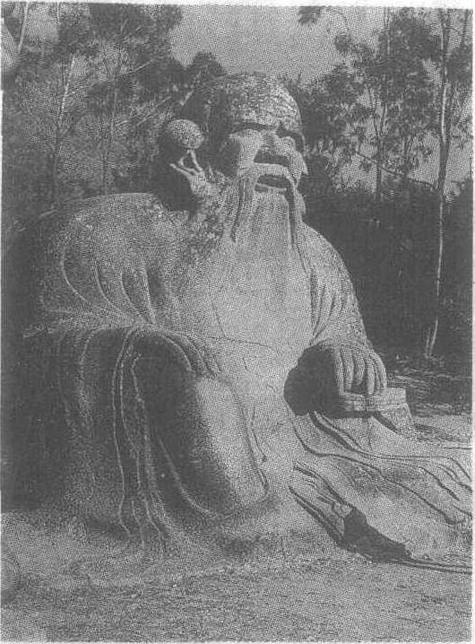 | 释义 | 石雕老君坐像南宋。高550厘米。福建省泉州市北清源山右峰罗山、武山下羽仙岩造像。花岗岩质。老君额头凸起,大耳如勾,身着宽袖大袍,足穿卷头履,右肘拄几,左手抚膝,身微右倾,端坐地上。其双目凹陷,颧骨凸突,长髯垂散胸前,张着嘴似在喃喃而语,一副饱经风霜泰然自若的神态,予人以崇敬感。此尊造像巨大,刀法圆熟,比例适度,雕刻细致,形神兼备,堪称宋代道教石雕艺术精品。