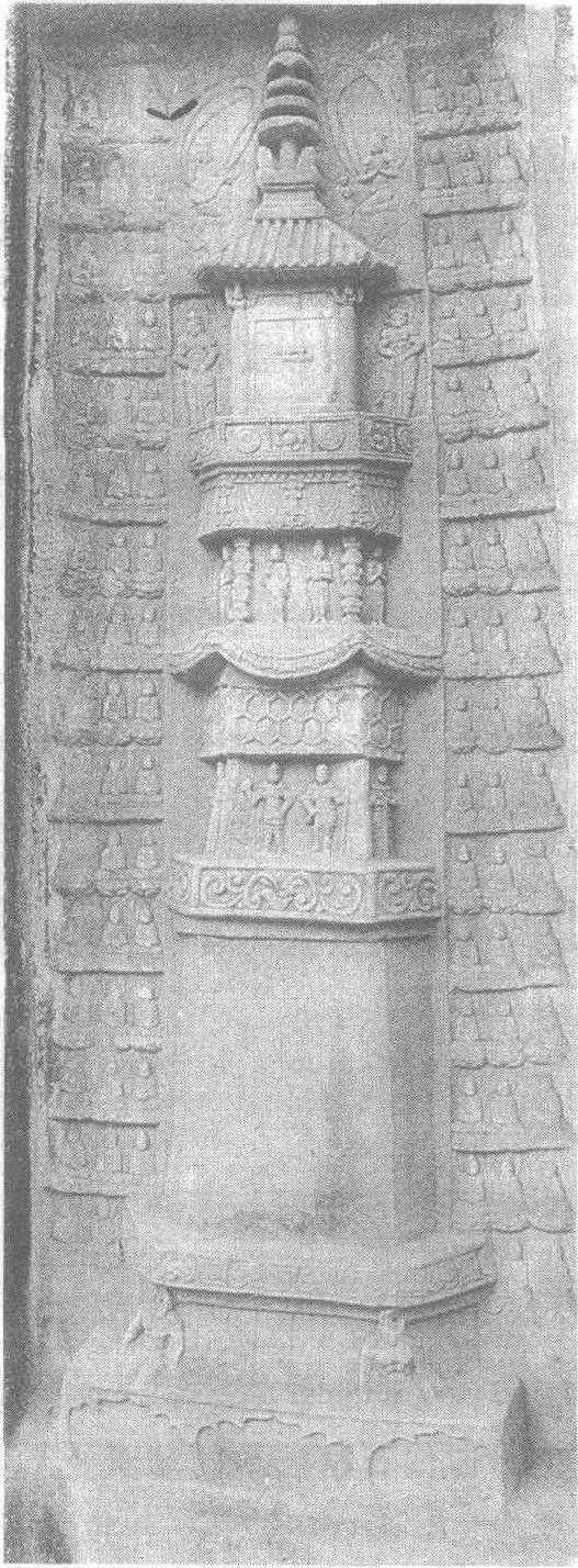 | 释义 | 石雕舍利塔唐天宝十年(公元751年)。通高293厘米。四川省巴中县南龛石窟第89号龛。南龛石窟位于巴中县城南一公里的南龛山腹,现存133窟,2100余躯。大量作品产生于唐代,石窟中的唐碑记载了造像的历史。此舍利塔雕作六级六方形(仅浮雕出三面)。第一级刻多边开光。第二级转角处刻力士,上身裸露,肌肉发达。第三级平座上饰回纹与如意云头纹相交的纹饰,塔身有碑文,现仅存“大唐天宝十载七月七日记”字样。第四级平座上阳刻卷草纹,塔身刻天王四身,短衣短裙,雄健有力。第五级塔身刻四身菩萨,丰满匀称,婀娜多姿。第六级平座刻团花和莲花相间的图案,塔身刻一开间建筑,大门紧闭,上挂锁。其屋顶自然地成为塔顶,筒瓦、出檐、斗拱俱全。塔刹由覆盆、刹杆、相轮、宝珠组成。塔刹两侧壁各雕飞天一身,塔后两壁各雕47尊坐佛,共16排。舍利塔造型修长秀丽,雕刻精细,具有典型的唐代风格。