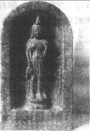 | 释义 | 石雕菩萨龛造像北魏正光二年(521)。通高54. 7厘米。菩萨立于半圆拱顶龛内,高髻宝冠,宝垂肩,直鼻长目,佩项饰,裸上身,宝石璎珞下垂至膝,脐前系圆壁珰,帔帛绕颈后,披落脚旁,著羊肠大裙,下摆齐踝,薄衣透体,衣纹作阴刻平行线,右手提裙边,左手点肋间。双手各戴三环,跣足直立仰覆束腰莲花座上。其身姿、服饰表现手法显然受印度笈多艺术风格影响。龛下部阴刻工整魏碑体字十三竖行,“大魏正光二年(521)三月二十日,清信佛弟子王阿保为生母敬造石佛像一区,愿生母上生天上受福无穷,现在眷属虽苦得乐果成佛道。”藏旅顺博物馆。