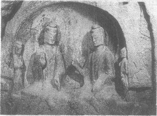 | 释义 | 石雕释迦、多宝佛像北魏。高160厘米,宽146厘米,深30厘米。甘肃省永靖县炳灵寺第125龛造像。释迦、多宝二佛左、右相对,含颏并坐说法。皆挽高肉髻,耳长至腮,五官棱角分明,于敏锐中透露着温和。二尊左右各立一眉目清秀,形体修长,宽衣博带相侍的菩萨。此四尊造像以瘦削见长,具有北魏晚期造像“秀骨清像”的明显特征。