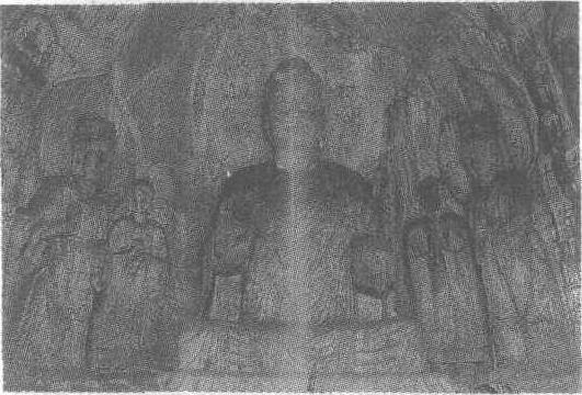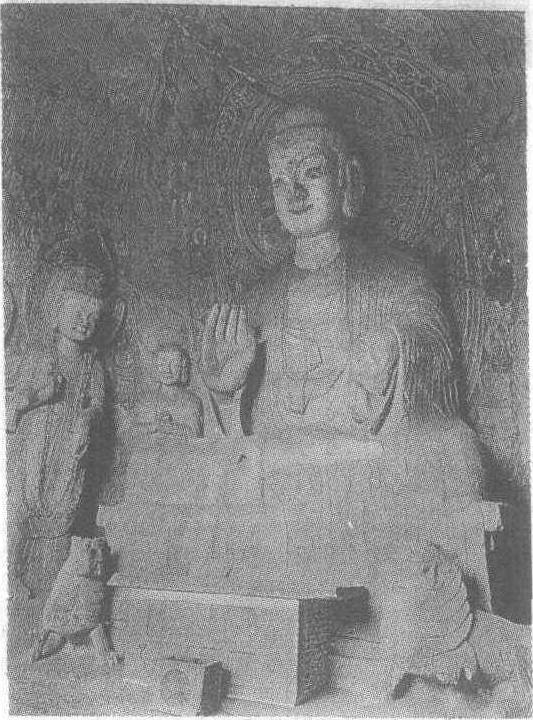 | 释义 | 石雕释迦牟尼佛像北魏宣武帝正始二年—孝明帝正光四年(公元505—523年)。高842厘米。河南省洛阳市龙门石窟宾阳中洞西壁主像。释迦牟尼佛现在世。佛挽刻满涡纹的高髻,内穿僧祗支,外着无领褒衣博带袈裟,肩、胸处底纹垂直平行,十分挺括。右手作施无畏印,左手曲肱下垂以食指点地,挺颈结跏趺坐于台座上,裙裾水波纹般重重折叠垂覆着台座。其脸形略长,半弯眉下,纤月般的双眼凝视着前方,鼻翼丰满,嘴角略向上翘,呈微笑状,面相清癯秀美,温和可亲。这尊佛像具有北魏龙门造像的基本特征,而褒衣博带的冕服式服装却是孝文帝汉化措施的反映,也是佛教艺术特征进一步民族化的表现。此尊造像体魄宏伟,表情生动,气势博大,是历代释迦牟尼佛像中最优秀的作品之一。“宾阳中洞”是龙门北魏石窟中较有代表性的汉化窟,平面近马蹄形,宽11.1米,深9.8米,高9.3米,窟中有主像三世佛(释迦牟尼佛的过去世,现在世,未来世)及其胁侍菩萨、弟子共11躯,圆雕,上承云冈昙曜五窟造像概括洗练,整体感强的特点,下启唐代造像丰满、圆润,由神秘性渐渐转向世俗化人性的写实作风,雄浑朴实,寓精巧于概括大方之中,充分显示了北魏雕塑家的卓越才华和高超的技艺。