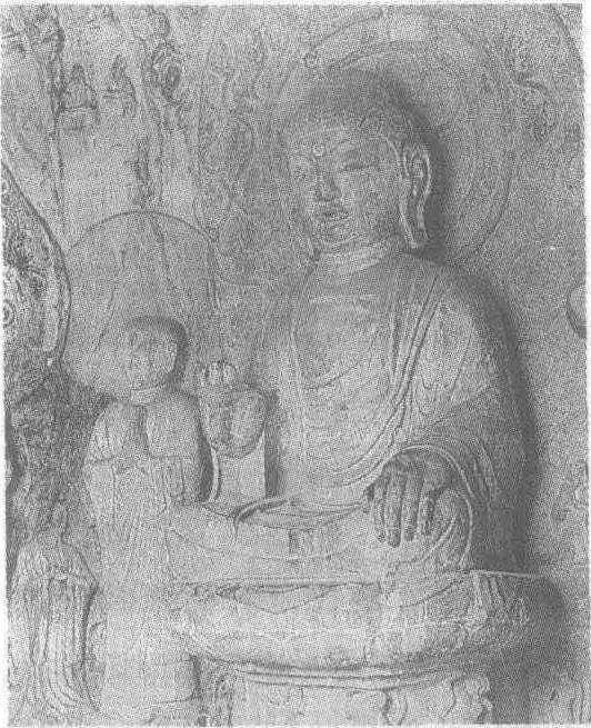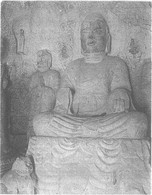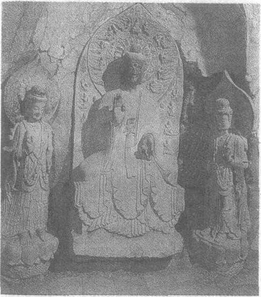 石雕阿弥陀佛像唐。高393厘米。河南省洛阳市龙门石窟万佛洞两壁中央主尊。头挽刻满涡纹的高肉髻,眉饰白毫相,长耳及颈,身着右袒式袈裟,衣褶条条凸起,颇有“曹衣出水”的意味。右手作施无畏印(手指现已残断),左手抚膝,结跏趺坐于覆仰莲高束腰须弥座上,目视前方,双唇微启,凝神沉思着,背光和头光由环带状分布的莲瓣纹、七个小化佛、蔓草形火焰纹组成。