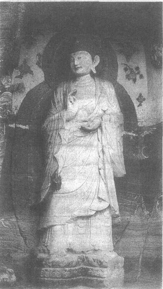 石雕阿弥陀佛像北魏。通高194厘米。甘肃省天水市麦积山石窟第127窟正壁龛佛造像。佛高挽的头髻上刻满涡纹,贴身僧祗支在胸前打成蝴蝶结。外穿宽袖袈裟,下着百褶长裙,右手作施无畏印,左手指残,似为降魔印,结趺坐于台座上,宽大的裙裾飘落于座下。其眉间饰白豪相,长圆的面庞上,柳眉、细目、小嘴均显露着笑意,神态颇为温和。舟形的背光和圆形的头光上,饰满飘逸流动、翩跹对舞的飞天,浓烈的火焰纹,曲卷的蔓草纹及零星的散花。此尊造像造型秀美,雕刻手法高超,为我国石窟造像不可多得的艺术珍品。对于此窟造像的创作年代,目前尚有争议,一些研究者认为是北魏,也有学者认为其应为西魏所作,究竟为西魏还是北魏,尚待进一步的研究。