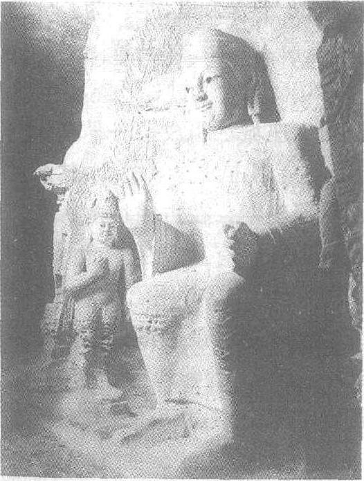 | 释义 | 石雕阿弥陀佛及胁侍菩萨像唐。高10米。山西省大同市云冈石窟第3窟后室塑像。第3窟是云冈最大的洞窟,北魏时开凿,原为大型塔庙窟设计,后因北魏迁都洛阳而辍工。 《续高僧传》:“东头僧寺,恒供千人。”即指此窟。唐代初年在此窟的后室凿出佛及菩萨像三尊。佛直身而坐,披通肩袈裟,衣袖宽大。头顶磨光肉髻,面型圆而饱满,双目炯炯有神,整个造型给人以丰厚敦实感。身后的背光雕刻得十分精细。两旁的菩萨均戴花式复杂的宝冠,秀发及肩,上身裸露,披巾绕肩而下垂,右手举至胸前,其中一菩萨手中还握有宝珠。菩萨面部的塑造风格与主佛相同,脸丰满,表情温和而不失气度。