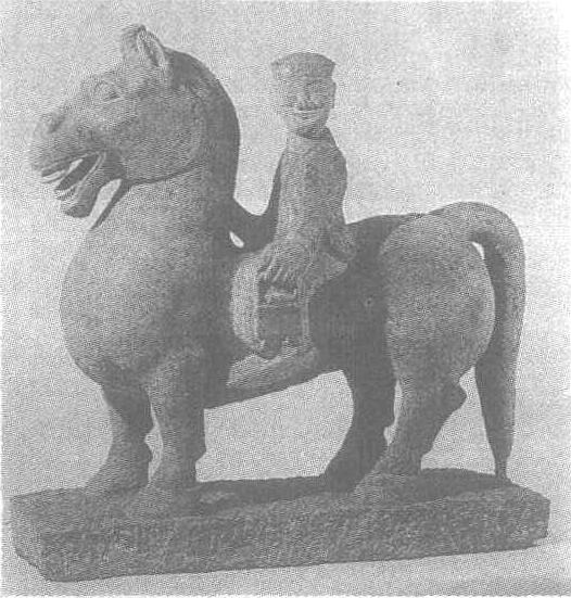 | 释义 | 石雕马与骑马俑像东汉。长77.2厘米,宽25厘米,高78厘米。1955年河北省望都二号汉墓出土。北京中国历史博物馆藏。马立于长方形石板上,昂首鼓胸,双耳直立,张嘴喘息着。骑在马背上的人,左手提壶,右臂挎鱼,侧着身体微笑着,一副悠然自得、轻松快活的样子。俑的身上绘有红、白、黑等色彩。此石雕刀法圆润,富于内在表现。