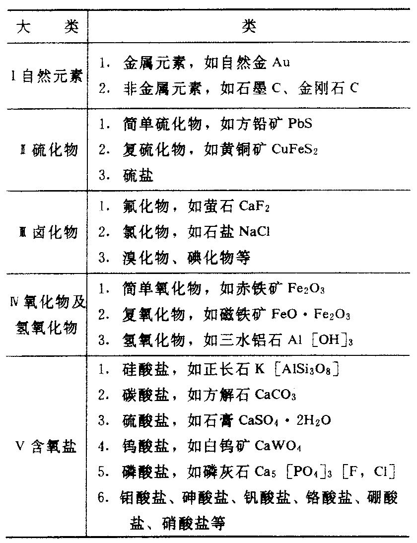 矿物分类Kuangwu fenlei按一定目的、需要和规则对矿物进行划分。目前已发现的矿物约有3 000多种,为了系统地研究和应用必须进行分类。由于目的、需要不同,研究方法不同,矿物的分类方法很多,有结晶分类、工业分类、成因分类、化学分类和结晶化学分类等。由于矿物的化学成分和结晶构造是决定矿物性质的基本因素,所以矿物的化学成分和结晶构造就成为矿物分类的主要依据。根据矿物的化学成分类型,可分为五大类,再根据阴离子或络阴离子种类可再分若干类如下表: 矿 物 分 类 表