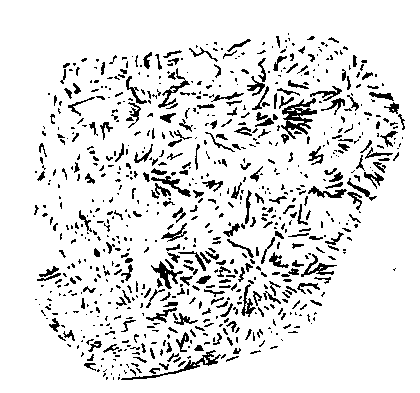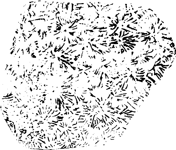 ❷放射状集合体,呈针状、长柱状或片状的许多同种晶体以一点为中心向外呈放射状排而成的矿物集合体,如放射状红柱石(菊花石)(如图)、放射状叶蜡石等。