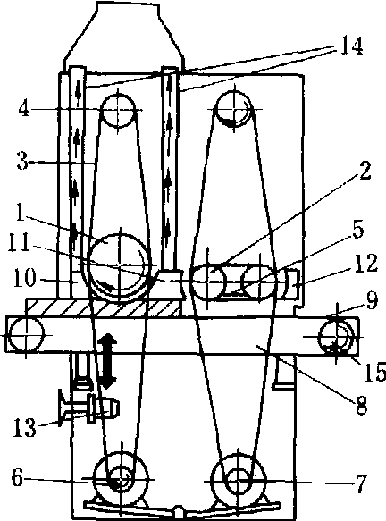 1.第一号砂架;2.第二号砂架;3.砂带;4.张紧辊;5.压板;6、7.电动机;8.工作台;9.进料运输带; 10、11、12.前、中、后压力规尺;13.工作台升降电机;14.除尘管;15.进料带传动装置