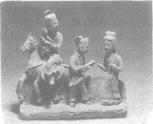 | 释义 | 砖雕卖子孝双亲金。高23厘米。山西省稷山县马村4号墓出土,山西省考古研究所藏。二十四孝故事之一。据传,古人刘明达非常孝顺父母,为了奉养双亲,他不惜卖掉儿子。此画面所表现的就是其卖儿时的情形:一个骑在高头大马上的人,手抱婴儿,回头观望;马下一人,面对左边神色凄然的妇女,平伸双手,似欲推她。妇女则麻木地盯着前方,呆望着。作者将母亲失去儿子的悲痛心理刻画得淋漓尽致,感染力极强。