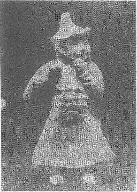 | 释义 | 砖雕吹笛童俑元。高39厘米。1973年河南省焦作市郊西冯封村出土。河南省博物馆藏。童俑头戴覆荷叶形多棱笠帽,结纽绳形双辫,一左一右垂于胸前,身着方领窄袖长袍,腰系四条饰带结枣形纽于腹部。俑作吹笛状(手中横笛已断失)。其凸额鼓腮,高鼻小嘴,蚕眼直视前方,神情十分专注,似乎陶醉于自己的乐声中。焦作元墓的这批砖俑,是先用粘土塑成立体泥俑粘在砖坯上,再进窑烧制成的。其生动的艺术形象,再现了元杂居和民间舞蹈表演的具体情景,形象逼真,生动活泼,具有浓厚的民间气息,给人以深刻的印象。