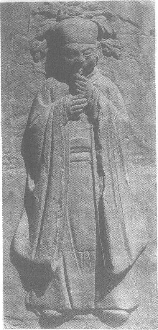 | 释义 | 砖雕吹觱篥乐俑金。高40厘米。1956年山西省襄汾县永固村金墓出土。山西省博物馆藏。乐俑浮雕在砖面上。其头戴刻有一朵盛开的牡丹花的圆环硬壳帽,身穿圆领、博袖近足的大袍,腰系饰带,面向前方,头微倾,两脚呈八字形站立,手捧觱篥于胸前,作吹奏状。眉梢高挑,面含微笑,两腮鼓圆,形神十分生动。“觱篥”,又名悲篥、笳管,是古代的一种吹奏乐器,本为古龟兹之器,后传入中原。