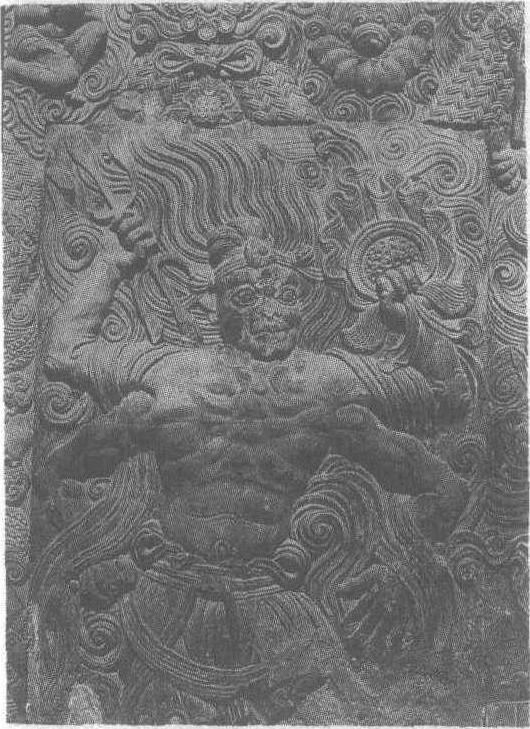 | 释义 | 砖雕四臂力士唐乾元元年至咸通十一年(公元758—870年)。高120厘米,宽86.5厘米。河南省安阳修定寺塔门左侧砖雕。力士头束卷绳形发髻,额饰宝花牌饰,袒上身,肌肉块块绽出,通肩长带顺臂飘曳下垂,下着短裙,腰带环腹缠绕数道后于肚脐下系一花结垂下。其粗眉高耸,圆眼怒睁,四臂一手握叉,一手攥环举至头旁,一手握拳,一手伸展抵腰际,状极悍猛。翻卷如浪的火焰纹和卷云纹,更增加了其豪悍的气势。塔门右侧另有一与之相呼应的力士,状亦孔武。这种四臂力士造型殊为奇特,且较为少见。修定寺塔身四壁外,满嵌不同类型的模制浮雕砖。内容极为丰富,包括佛、菩萨、力士、狮、象、马、兽面以及莲花、忍冬等纹饰70余种,其工艺之精良,装饰趣味之浓厚,整体效果之华美,在现存唐代建筑遗迹中少有媲美者。