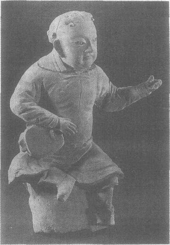| 释义 | 砖雕弹三弦俑元。高36厘米。1973年河南省焦作市郊西冯封村出土。河南省博物馆藏。靠背砖已失,童俑顶发当额下垂一小绺,如桃式,余发分编两辫于耳后(这是古代蒙古男子习惯的发型),身穿窄袖上衣,下着宽管短裤,腰扎护围,足蹬尖靴,垂左腿,屈盘右膝坐于凳上,双手执三弦(弦杆已失),倾身作弹奏状。其鼻梁高挺,小嘴紧闭,垂腮圆鼓,两眼盯着琴弦,专注的神情中流露着童稚的好奇,颇逗人喜爱。“三弦”产生于元代,和琵琶、笙、笛、鼓板等乐器用于杂剧伴奏。