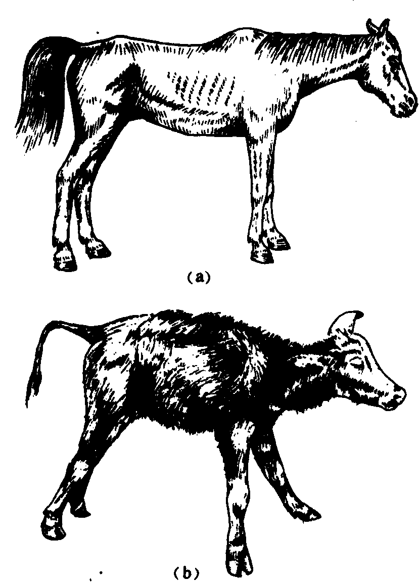 破伤风poshangfeng由 一种厌氧细菌— —破伤风梭菌( )侵入伤口后引起的严重感染。这种细菌广泛地存在于泥土中,因此,被带有泥土的锈钉或木片等刺伤后易患破伤风。侵入伤口的细菌在缺氧的环境中生长繁殖并产生外毒素而引起症状。一般发病多在伤后4~14天左右,初始常感乏力、头痛及不适等,继之出现面部肌肉痉挛而开口困难,并逐渐出现颈背肌和全身肌肉的阵发性抽搐,同时大汗林漓及呼吸窘迫,但神志清醒。此症仍有较高的死亡率。因此,对伤后出现上述症状或可疑者应及时送医院救治。当然,搞好预防可减少破伤风发生的机会或降低其严重性。最简便有效的措施是早期正确地处理伤口,并酌情注射破伤风抗毒素(应先作过敏试验)。其次是进行主动免疫,即按规定分期注射破伤风类毒素,则可获得有效的免疫能力。如果注射人抗破伤风免疫球蛋白效果更好,但价格昂贵且稀少。 破伤风tetanus疫疠之气经畜体伤口侵入,引起病畜以肌肉持续的强直性痉挛为特征的病证,又称“强直症”。其病原现代兽医学认为是破伤风梭菌。始见于《安骥集药方》。在《元亨疗马集》中对本病的症状和治疗已有系统记载。多因阉割,断尾、剪毛、脐带感染等情况下,广泛存在于施肥土壤、腐臭淤泥及街道尘土中的破伤风梭菌侵入,由皮肤而传腠理,腠理传于内,营卫被扰而不得宣通,邪犯其内,引动肝风。 本病的潜伏期,短者伤后24小时即可发病,长者可达数月,一般为7~14天。由于病邪侵入的部位不同,临证表现也有差异。初期邪在腠理,表现轻度皮紧肉硬,头颈转动不灵活,运步稍紧张,咀嚼缓慢,牙关略紧,眼神紧张,若猛令患畜抬头时,则见瞬膜外露。口色偏红,脉浮而有力;中期邪已内犯,闭塞经脉,筋脉失养,则见浑身拘急,四肢僵硬, 口禁涎生,耳紧尾揭, 口色深红,脉弦数有力;病至后期邪毒已传遍经络,津液大伤,引动肝风,则见牙关紧闭,水草难进,头颈伸直,尾根高举,腰部下陷,行走困难,状如木马(图)。牛和羊常发生瘤胃臌胀。猪则满嘴白沫,叫声尖细。病情继续发展,导致全身衰竭,卧地难起, 口色青紫,脉细数无力或出现结代脉象。最后多因过度衰竭,呼吸困难,窒息而死,或继发唾液涎沫入肺而死。治宜初期祛风解毒, 镇惊止痉, 并结合扩创烧烙,以清除毒源; 中期祛风镇惊,解毒止痉, 和血通络, 以祛毒邪; 后期清热熄风, 除痰镇痉, 益气养阴,以扶正祛邪。治疗贵在早期用药配合精心护理。凡马患破伤风,口松涎少者可治;口紧涎多者难医; 脊腰僵硬者, 亦难治。选用千金散、五虎追风散、祛风镇痉汤或乌蛇全虫散(《全国中兽医经验选编》: 乌蛇、全虫、蝉蜕、金银花、白菊花、防风、酒当归、南星、川羌活、酒大黄、栀子、生黄芪、桂枝、地龙、荆芥、甘草、麻根、黄酒250克为引)加减。伤在头部,加白芷、薄荷; 口涎多者, 去黄芪、麻根, 加白芍药、干姜、姜半夏; 腰背强直严重者, 加炒僵蚕、酒川断、血竭; 四肢强直严重者, 加独活、茯苓、红花、木瓜; 粪便干燥便秘者, 加大黄、芒硝、郁李仁; 尿不通畅者, 加车前子、茯苓。根据患畜体质和膘情的不同, 可用针灸疗法。病初放鹘脉血 (放血量马牛为800~1500毫升), 并针大风门、风门、伏兔、百会、开关、锁口等穴。鼻内吹入疗风解沫的朱砂散(《元亨疗马集》:朱砂、雄黄、麝香、皂角、芸薹子)。宜将患畜拴系于光线弱的安静而又空气流通的厩舍内, 耳内填塞棉花以防过强音的刺激。在患畜肘后和膝前的下腹, 各系一结实而柔软的绳索以防倒地。供给充足的清洁饮水, 患畜尚能咀嚼者, 经常给予少量干硬饲料(如玉米粒)或稻草谷节, 以减缓咀嚼肌肉的痉挛。