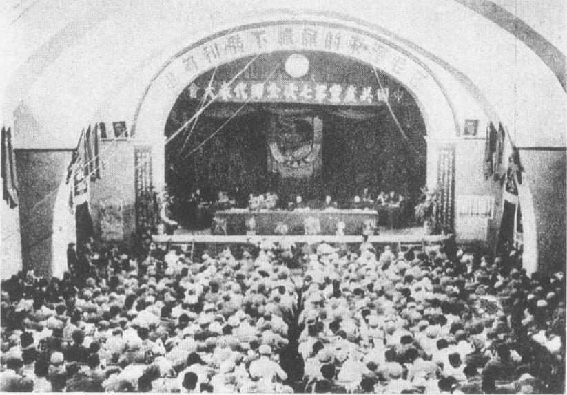 中共 “七大” 大会会场内景 大会通过了 《关于政治报告的决议案》、《关于军事报告的决议案》和《中国共产党党章》。此外,还通过了 《关于死难烈士追悼大会的决议》。 大会深刻分析了国内外形势, 总结了共产党领导中国民主革命的经验, 特别是抗战时期国共两党不同抗战路线斗争的经验,指出在中国面临着两种命运、两个前途的斗争, 全党和全国人民的任务, 就是用全力去争取光明的前途和光明的命运。为此, 大会制定了“放手发动群众,壮大人民力量,在我党的领导下打败日本侵略者, 解放全国人民, 建立一个新民主主义的中国”的政治路线, 并号召全党要为废止国民党一党专政, 建立民主联合政府而奋斗。 在军事方面, 大会要求八路军和新四军逐步实现从抗日游击战争到正规战争的战略转变, 以迎接抗日反攻阶段的到来, 争取抗日战争的最后胜利。 在党的建设方面, 大会强调了在思想上、政治上建党的重要性。大会通过的新党章,第一次明确规定:中国共产党以马克思列宁主义的理论与中国革命实践之统一的思想——毛泽东思想, 作为自己一切工作的指针。 大会以无记名投票的方式,选举产生了由44名中央委员和33名候补中央委员组成的第七届中央委员会。会后,中共中央举行七届一中全会,选举毛泽东、朱德、刘少奇、周恩来等13人为政治局委员,选举毛泽东为中央委员会主席兼中央政治局、中央书记处主席, 选举毛泽东、朱德、刘少奇、周恩来、任弼时为中央书记处书记。 中共“七大”是一次团结的大会,胜利的大会,它为中国共产党夺取抗日战争的最后胜利和后来人民民主革命在全国的彻底胜利奠定了基础。 中国共产党第七次全国代表大会Zhongguogongchandangdiqiciquanguodaibiaodahui1945年4月23日至6月11日在延安举行。大会正式代表547人,候补代表208人,代表全国党员121万人。毛泽东在会上作了《论联合政府》的政治报告,关于形势和思想政治问题的报告、关于讨论政治报告的结论和关于选举问题的讲话;朱德作《论解放区战场》的军事报告和关于讨论军事问题的结论;刘少奇作《关于修改党的章程的报告》和关于讨论组织问题的结论;周恩来作《论统一战线》的重要发言。大会通过政治决议案、军事决议案和新的党章。大会系统地总结党24年来领导中国革命的经验,深刻地论述新民主主义的基本理论,指出党的路线是:放手发动群众,壮大人民力量,在我党的领导下,打败日本侵略者,解放全国人民,建立一个新民主主义的中国。大会总结了武装斗争、统一战线和党的建设的经验,深刻地论述了进行新民主主义革命的“三大法宝”以及党的三大作风——理论和实际相结合、密切联系群众和自我批评。大会通过的新党章规定,以马克思列宁主义的理论与中国革命的实践之统一的思想——毛泽东思想,作为党的一切工作的指针。大会以无记名投票的方式,选举产生了由44名中央委员和33名候补中央委员组成的第七届中央委员会。七大是一次团结的大会,胜利的大会,使全党达到了空前的巩固和团结,为抗日战争的胜利和后来人民民主革命在全国的胜利奠定了巩固的基础。 中国共产党第七次全国代表大会1945年4月23日至6月11日在延安举行。决定了“放手发动群众、壮大人民力量,在中国共产党的领导下,打败日本侵略者,解放全国人民,建立一个新民主主义的中国”的路线,通过了新党章,选举了新的中央委员会。新党章规定以马列主义理论与中国革命实践相统一的毛泽东思想为中国共产党一切工作的指针。这是一次团结的、胜利的大会。 |