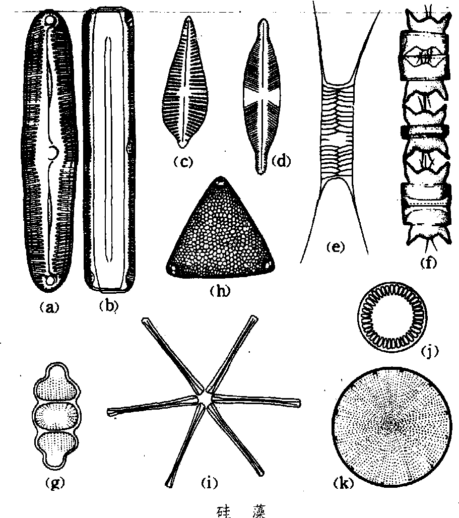 (a、b)微绿羽纹藻的壳面和带面; (c)叶状囊线藻; (d)双凸贝纹藻; (e)双列四棘藻; (f)长耳盒形藻;(g)双列哑铃藻; (h)卡氏角刺藻; (i)星芒星杆藻;(j)圈形小环藻;(k)圆筛藻